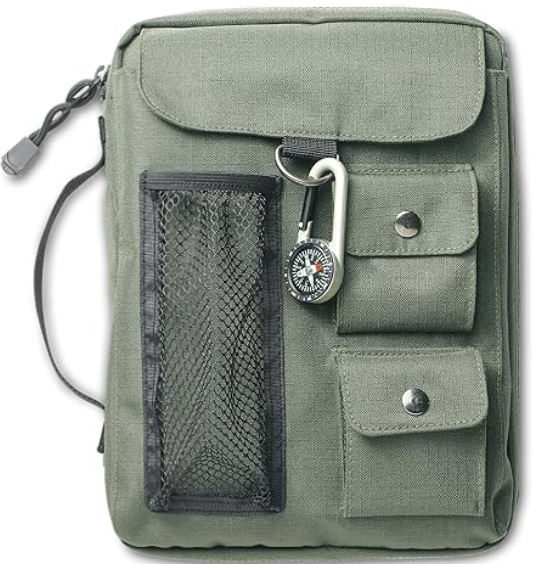 Ready for an adventure, this Bible cover has plenty of secure snap pockets for all your needs. Made of olive green rip-stop material with a sturdy carrying handle and durable zipper pulls, this Bible case will protect your Bible and other materials wherever you go, even in the great outdoors. A compass carabiner clip offers an extra accessory for your journeys and makes this a great option for protecting your Boy Scouts Handbook as well!